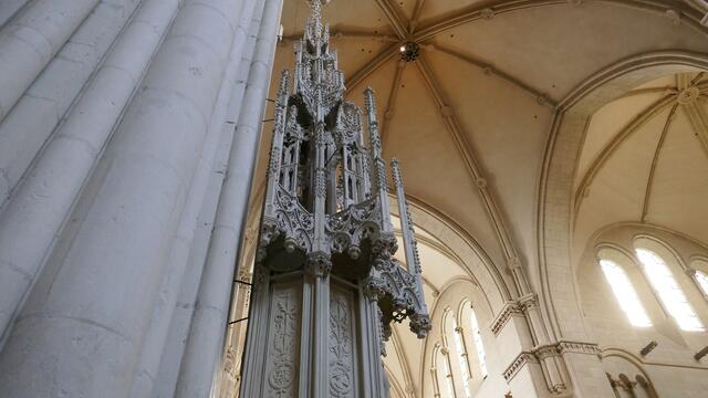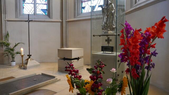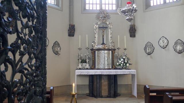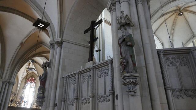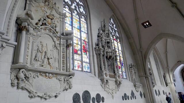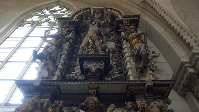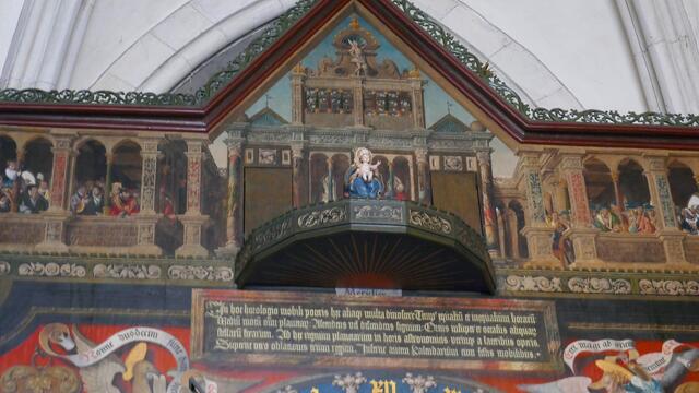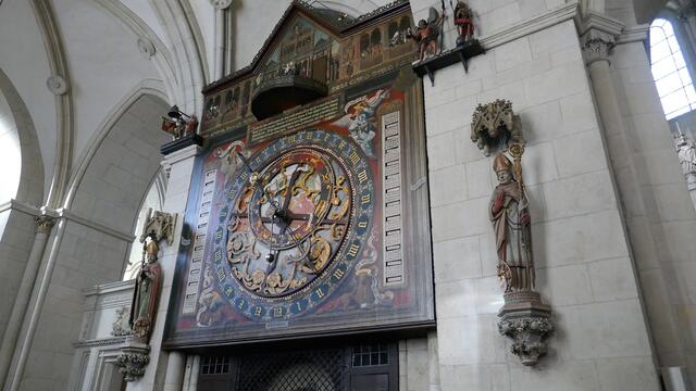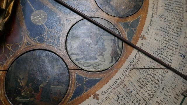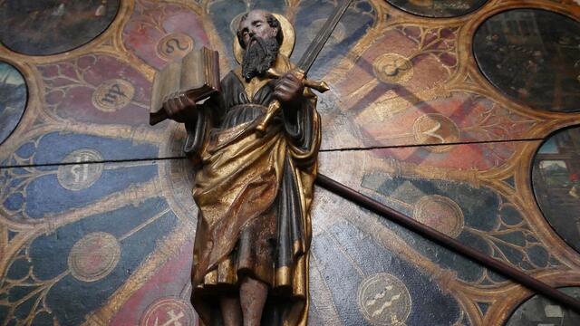 Die astronomische Uhr ist nicht nur ein technisches Meisterwerk. Auch Malerei und Schnitzwerk sind hohe Kunst. Im Zentrum der Kalenderscheibe steht der Apostel Paulus, der Namenspatron des Doms. Sie hängt an einem ungewöhnlichen Ort, fast versteckt im Chor des Doms zu Münster: die astronomische Uhr. 1408 wurde sie gefertigt, während des Bildersturms 1534 zerstört und wenige Jahre später erneuert. Neben der Uhrzeit – der Stundenzeiger läuft erstaunlicherweise linksherum – zeigt sie Mondphasen...