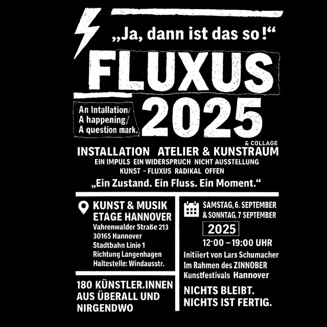 Fluxus 2025 – „Ja, dann ist das so!“ Ein lebendiges Archiv künstlerischer Widerständigkeit und Erneuerung Am 6. und 7. September 2025 verwandelt sich die Kunst & Musik Etage Hannover in ein pulsierendes Zentrum der künstlerischen Intervention: Fluxus 2025 – „Ja, dann ist das so!“ bricht radikal mit den Konventionen klassischer Ausstellungspraxis und inszeniert stattdessen ein partizipatives Happening – eine flüchtige Konstellation aus Stimmen, Gesten und Provokationen. Initiiert und kuratiert...