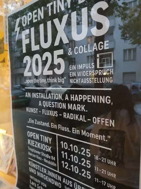 FLUXUS 2025 – OPEN TINY BIG - Kunst als Zustand, nicht als Ausstellung Berlin, Oktober 2025. Zwischen Sonnenallee und Karl-Marx-Straße, dort wo der Alltag pulsiert und die Stadt ihre rauen, poetischen Seiten zeigt, öffnete sich für drei Tage ein Raum, der alles andere als gewöhnlich war: Der OPEN TINY KIEZKIOSK in der Treptower Straße 84 wurde zum Schauplatz eines künstlerischen Ausnahmezustands – FLUXUS 2025 & COLLAGE – OPEN TINY BIG. Was hier geschah, war keine Ausstellung. Es war ein...