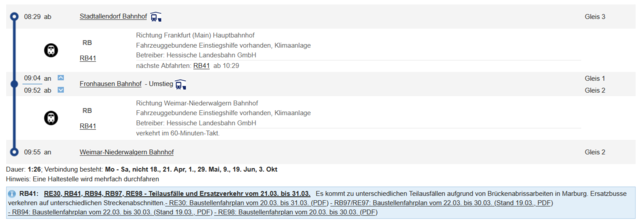 Lohnt es sich, irgendwelche Anomalien in der Fahrplanauskunft oder auf den Anzeigen der Deutschen Bahn zu untersuchen? Manchmal schon, wie die folgende Geschichte zeigt. Am 7. Juli 2018 warte ich morgens in Kirchhain auf den RE30 und wundere mich über den Text auf der Anzeige: Die RB 41 nach Treysa, Abfahrt 10:28 Uhr, fällt heute aus. Die ungewohnte Abfahrtszeit hängt mit dem Baustellenfahrplan zusammen. Allerdings kann der Zug an diesem Tag gar nicht ausfallen, weil Samstag ist und er sowieso...