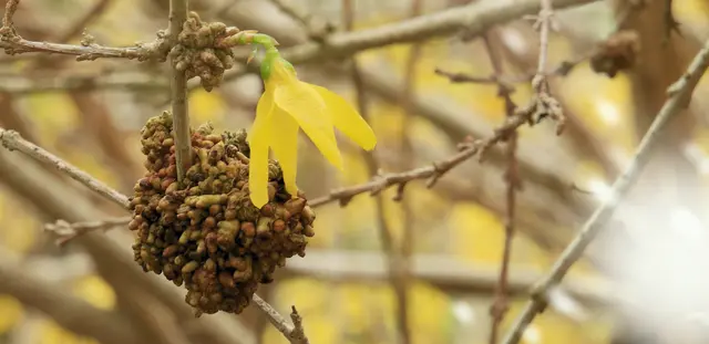 Die blumenkohlartigen Gallen an Forsythien werden durch das Bodenbakterium "Rhodococcus fascians" verursacht ...