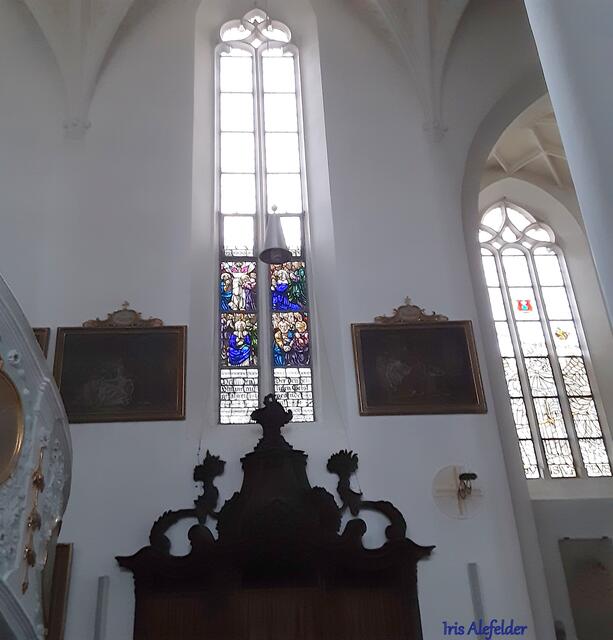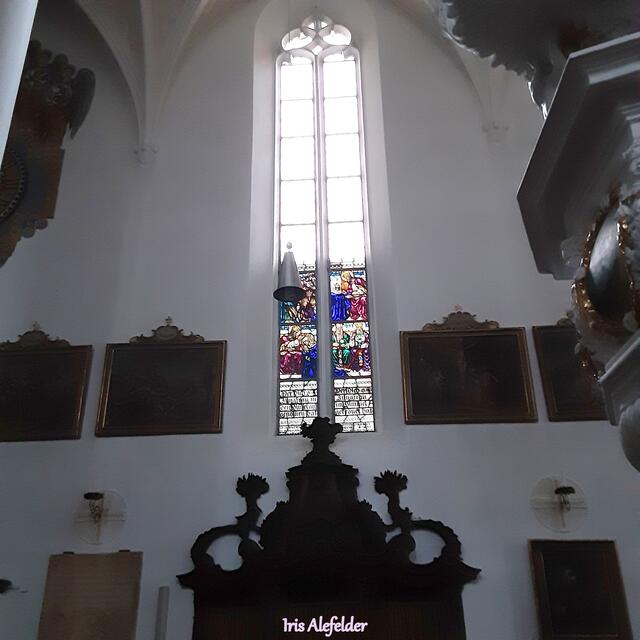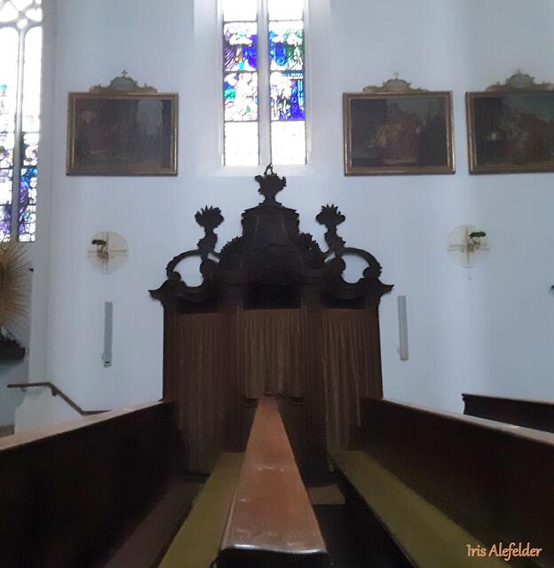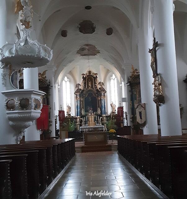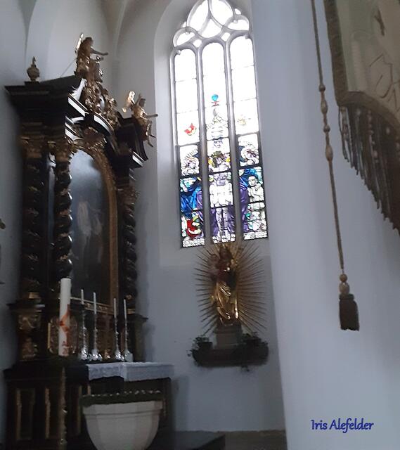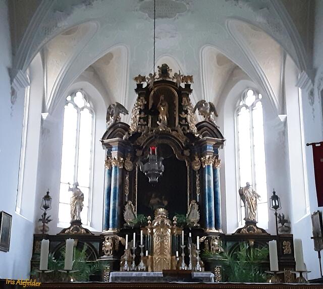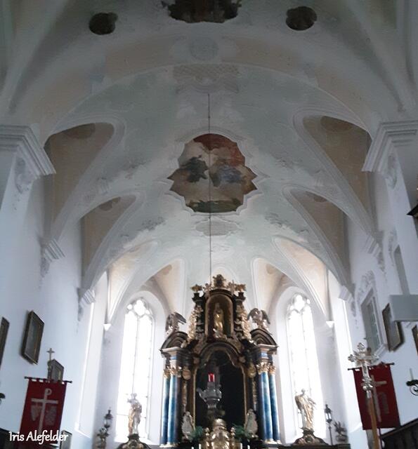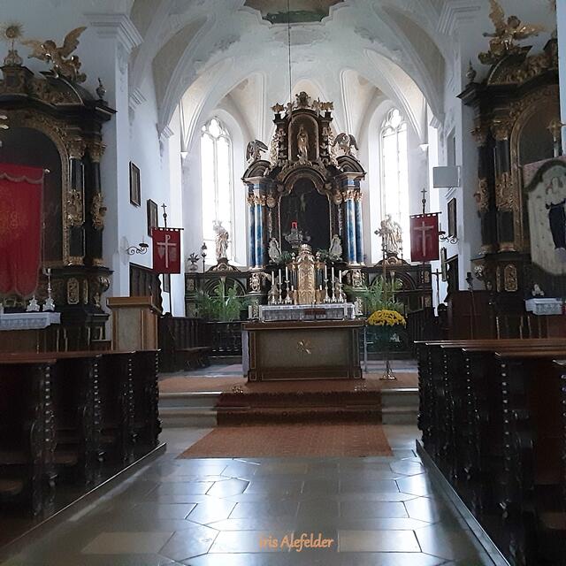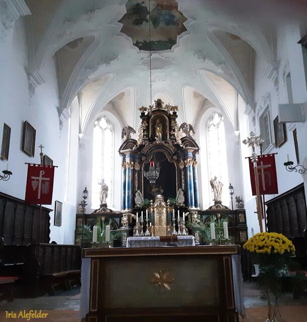 Das Altarblatt des Hochaltars zeigt ein Bildnis, das die Legende zum Skapulier darstellt: "Demnach erschien 1251 die Mutter Gottes in Camebridge (England) dem heiligen Simon Stock, dem Ordensgeneral der Karmeliter. Sie überreichte ihm das einfache Skapulier als Zeichen des Heils, zum Schutz in Gefahren, als Unterpfand für den Frieden. Wer mit dem Gnadenzeichen sterbe, werde das ewige Feuer nicht leiden. ( Text von Anton Kapfer )