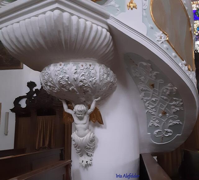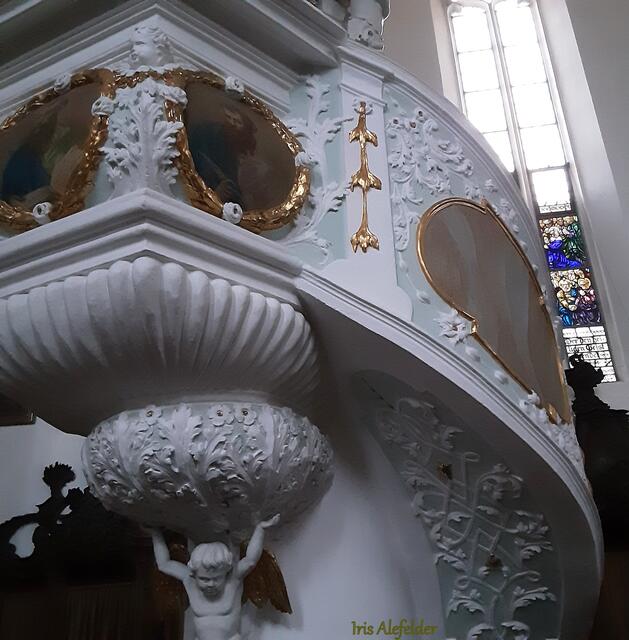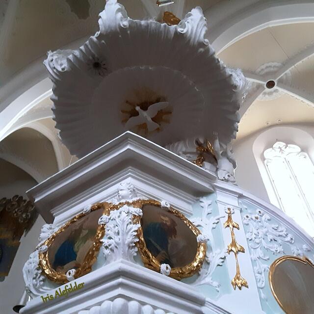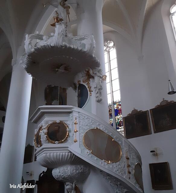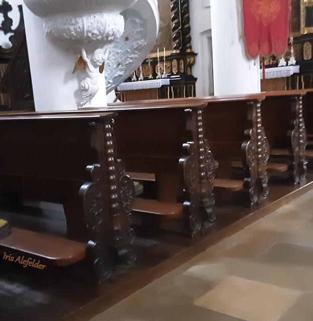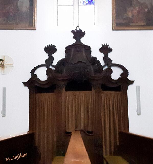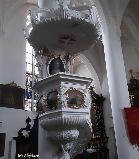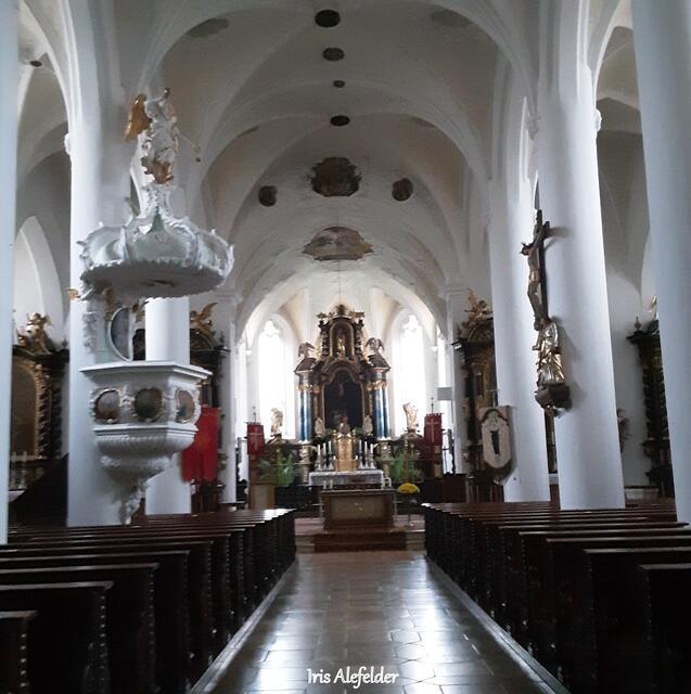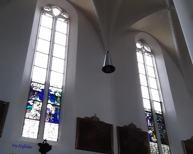 Das Altarblatt des Hochaltars zeigt ein Bildnis, das die Legende zum Skapulier darstellt: "Demnach erschien 1251 die Mutter Gottes in Camebridge (England) dem heiligen Simon Stock, dem Ordensgeneral der Karmeliter. Sie überreichte ihm das einfache Skapulier als Zeichen des Heils, zum Schutz in Gefahren, als Unterpfand für den Frieden. Wer mit dem Gnadenzeichen sterbe, werde das ewige Feuer nicht leiden. ( Text von Anton Kapfer )
