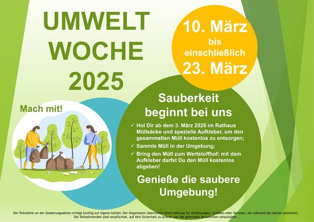 Die Umweltwoche 2025, die vom Landratsamt Günzburg initiiert wurde, findet in der Stadt Burgau sowie in allen Stadtteilen von Montag, 10.03.2025, bis einschließlich Sonntag, 23.03.2025, statt. In diesem Jahr sind die Bürgerinnen und Bürger wieder eingeladen, an einer Müllsammelaktion teilzunehmen und damit ihren Beitrag zum Naturschutz und zur Schaffung einer sauberen und attraktiven Umgebung zu leisten. Das Motto im Jubiläumsjahr der 40. Umweltwoche 2025 in Burgau lautet: „Sauberkeit beginnt...