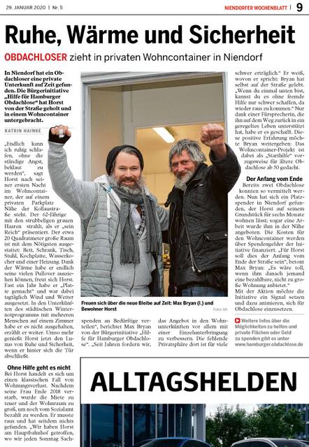 \\\ Ruhe - Wärme - Sicherheit /// In Niendorf hat ein Obdachloser eine private Unterkunft auf Zeit gefunden. Die Bürgerinitiative „Hilfe für Hamburger Obdachlose“ hat Horst vergangene Woche (23.1.) von der Straße geholt und in einem Wohncontainer untergebracht. „Endlich kann ich ruhig schlafen, ohne die ständige Angst, beklaut zu werden“, sagt Horst nach seiner ersten Nacht im Wohncontainer, der auf einem privaten Parkplatz Nähe der Kollaustraße steht. Der 62-Jährige mit den strubbeligen grauen...