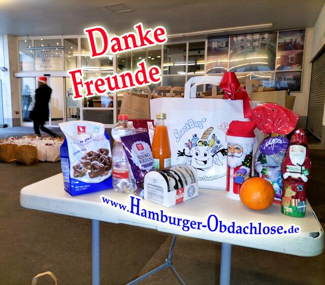 "Menschen für Menschen begeistern" = Menschen für Obdachlose begeistern - das hat auch letzten Sonntag wieder gut geklappt. Der Hoteldirektor eines unmittelbar in der Nähe zum Hauptbahnhof liegenden 4-Sterne-Hotels arrangierte die Übergabe von gut 80 Weihnachtspräsenten zur Verteilung an Obdachlose und Bedürftige am Hamburger Hauptbahnhof. RIESEN DANK für diese tolle Geste! Auch Strom und Wasser für den Betrieb des Teekessels wird von einem der benachbarten Hotels bereit gestellt und es ist...
