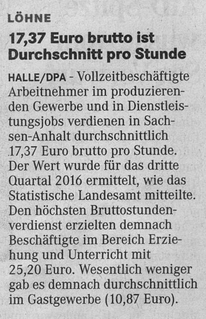 Den Artikel habe ich im heutigen Naumburger Tageblatt gefunden. Also in meinem Bekannten und Freundeskreis hat keiner diesen Durchschnittslohn, geschweige darüber. Natürlich kann ich auch die falschen Bekannten und Freunde haben. Reich sind halt immer die Anderen.