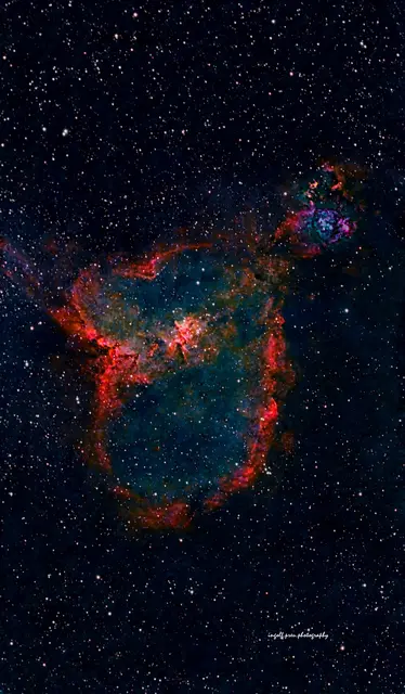 Der Herznebel (offizielle Bezeichnung IC 1805) ist ein großer Emissionsnebel im Sternbild Kassiopeia, der etwa 7.500 Lichtjahre von der Erde entfernt ist. Er verdankt seinen Namen seiner markanten Form, die an ein menschliches Herz erinnert. Der Nebel besteht aus Wolken aus ionisiertem Wasserstoff und dunklen Staubregionen. Im Inneren befindet sich der offene Sternhaufen Melotte 15. Die massereichen, jungen Sterne in diesem Zentrum erzeugen durch ihre intensive Strahlung und Sternwinde das...