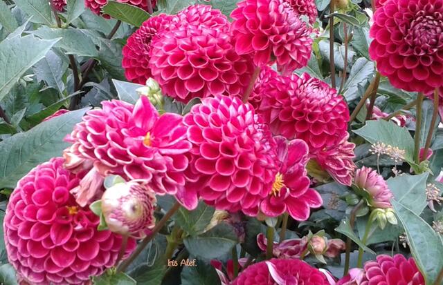 Feingliedrige Dahlien in den Farben pink, lila blühen mit vielen anderen Blumen auf großen Beeten um die Wette.