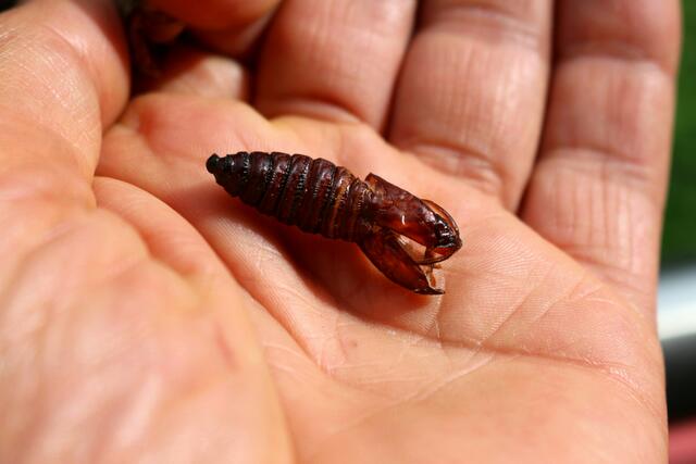Vor etwa drei Wochen haben wir beim Aufräumen des Gartenhäuschens in einem Eimer mit Kies eine große Schmetterlingspuppe gefunden. Sie wurde mit etwas Kies vorsichtig in ein Gurkenglas umgesetzt und mit einem Fliegengitter abgedeckt zur Beobachtung in ein schattiges Plätzchen auf dem Balkon gestellt. Heute ist aus der Puppe der Schmetterling geschlüpft. Das Gitter wurde entfernt und als Krabbelhilfe ein Kochlöffelstiel angeboten, der sofort genutzt wurde. Dort sitzt das Tierchen noch immer....