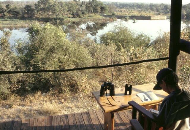 Mit Fernglas und Vogelbestimmungsbuch im schattigen Zelt bei Sonnenaufgang. So fängt der Tag gut an.