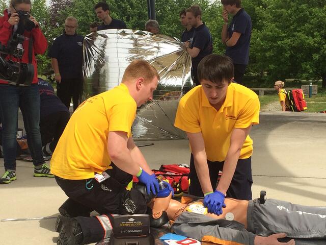 v.l.Katharina Anderten und Katharina Stander üben die erweiterte Herz-Lungen-Wiederbelebung