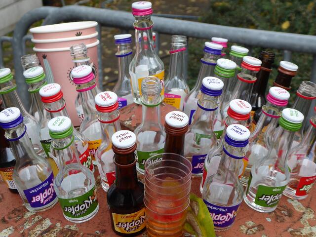 Links 2 x Pokal zum NiBB-Innovationspreis, in der Mitte die Statuette zum KIT-Medienpreis, rechts das Gestgeschenk. Im Vordergrund Flyer der http://www.KIT-Initiative. Bild: Copyright ©. Fotografin: U. B.-S.