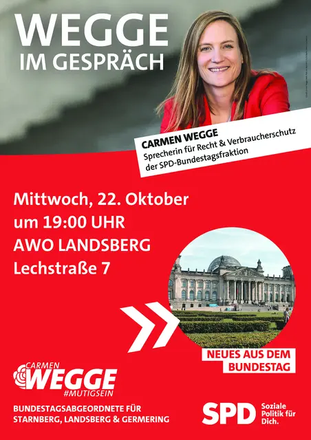„Wegge im Gespräch Der SPD-Ortsverein Landsberg am Lech lädt gemeinsam mit seiner SPD-Bundestagsabgeordneten Carmen Wegge zum Veranstaltungsformat „Wegge im Gespräch“ ein. Die Veranstaltung findet am Mittwoch, 22. Oktober 2025 um 19:00 Uhr in den Räumlichkeiten der AWO Landsberg in der Lechstraße 7 in Landsberg statt. Im Rahmen der Veranstaltung wird Wegge von den aktuellen Entwicklungen im politischen Berlin berichten, mit den Bürgerinnen und Bürgern in Dialog treten und sich ihren Fragen,...