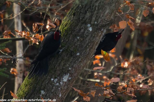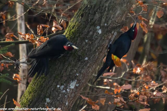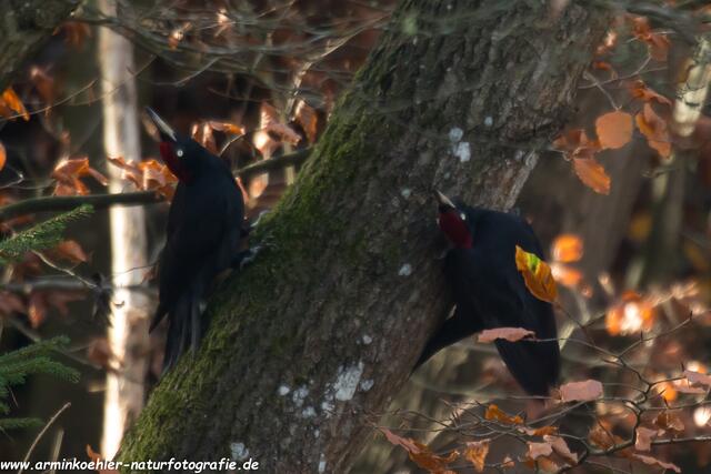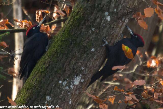 Gestern konnte ich den Kampf zweier Schwarzspechte beobachten und ein paar Fotos davon machen. Der Kampf dauerte ca. 25 Minuten. Ständig versteckten sich die beiden vor ihrem Gegenüber hinter dem Baumstamm, an dem sie hingen, um dann wieder zu attackieren und sich dann wieder zu verstecken. Es war sehr interessant die beiden seltenen Vögel zu beobachten. Obwohl die Fotos ziemlich ähnlich sind, zeigen sie doch einige Attacken. Für mich war es wieder mal eine schöne Beobachtung.