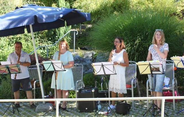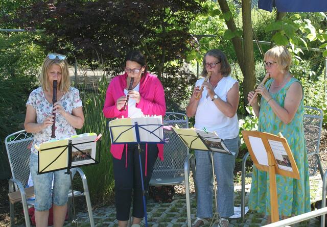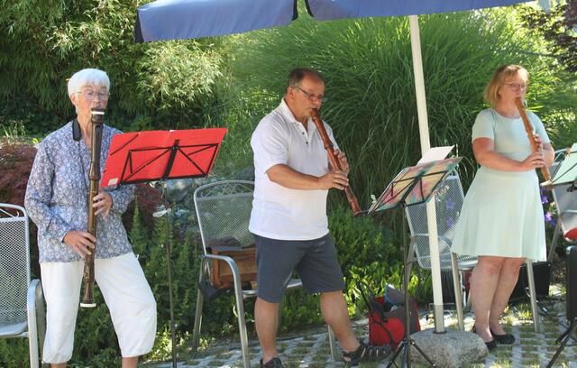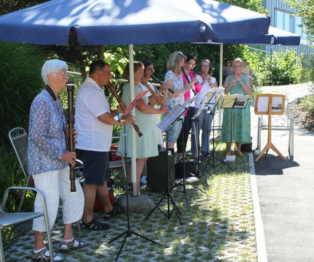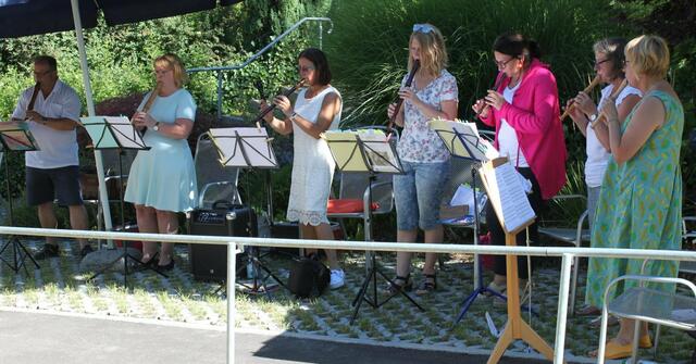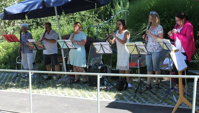 Eine willkommene Abwechslung boten die Mitglieder des Blockflöten-Ensembles „Flauti Concertanti“, unter der Leitung von Musiklehrerin Karolina Wörle, den Bewohnern der Senioreneinrichtung St. Klara in Wertingen. Bei sommerlichen Temperaturen fanden sich viele Zuhörer und die Musiker im Garten des Pflegeheims ein. Das 30-minütige „Ständchen“ begann mit Tanzweisen in schwäbischer Art des Frauenstettener Künstlers Robert Maximilian Miller. Volkslieder wie „Ännchen von Tharau“, „Das Lieben bringt...