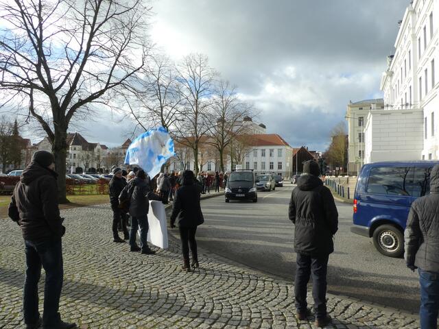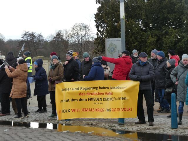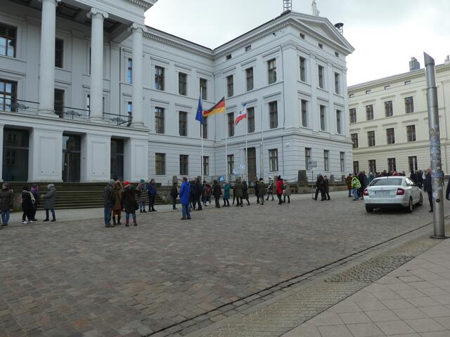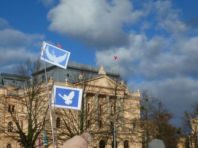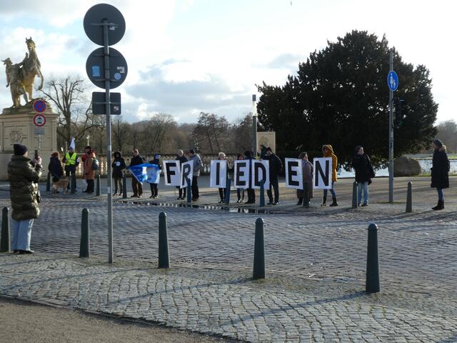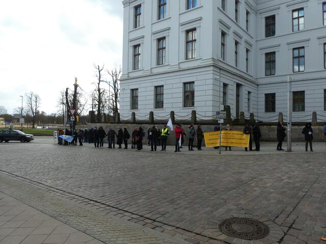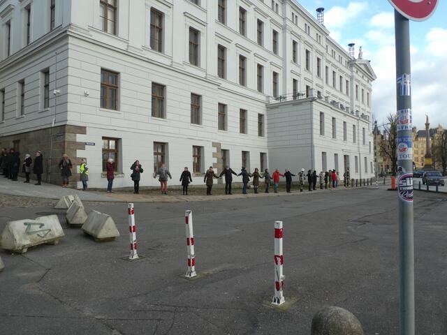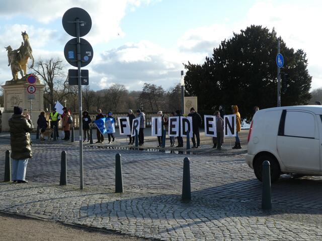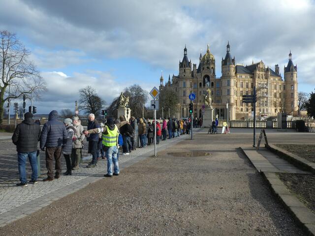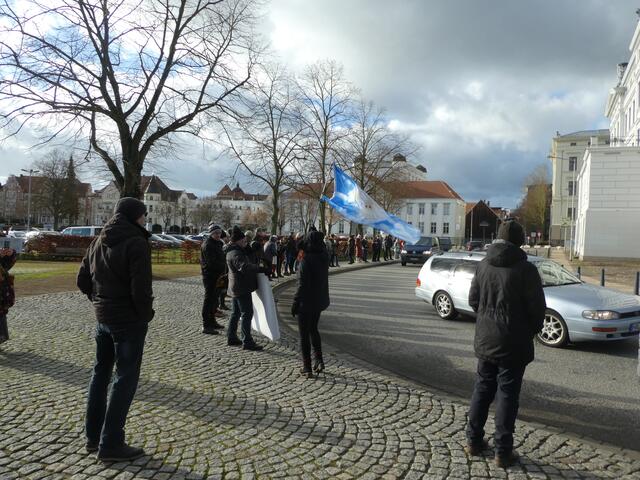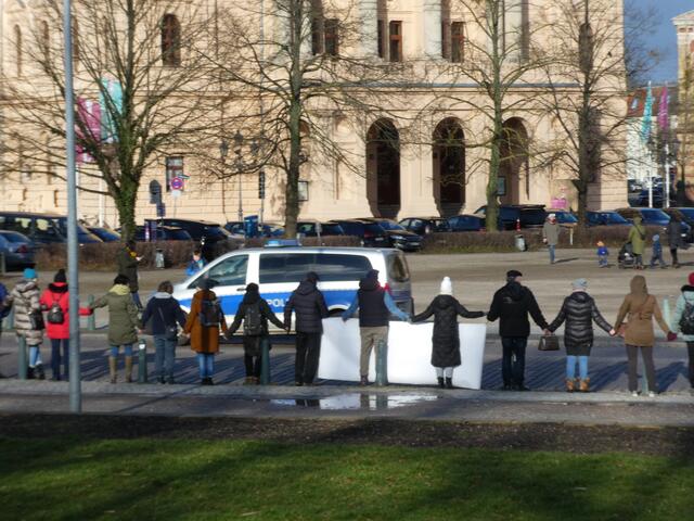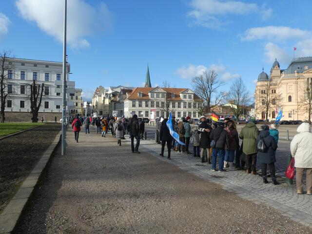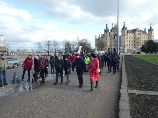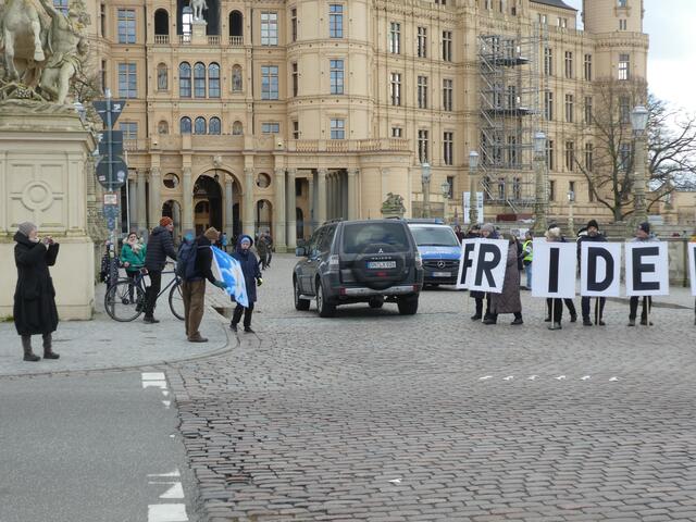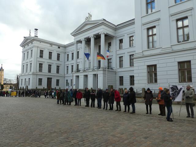 Zu einer Demonstration gegen den Krieg und für den Frieden versammelten sich ca. 200 - 250 Bürger aus den umliegenden Städten wie Hagenow und Ludwigslust und weitere Dörfern des Schweriner Umlandes in Schwerin, zwischen der Staatskanzlei und dem Schweriner Schloss. Bei eisigen Wind hielten diese Menschen tapfer durch und versuchten die Staatskanzlei mit einer Menschenkette zu umrunden. leider rechte es am Ende zwar nicht, aber die Botschaft war gut angekommen. Der 360 Grad Kreis schloss sich...