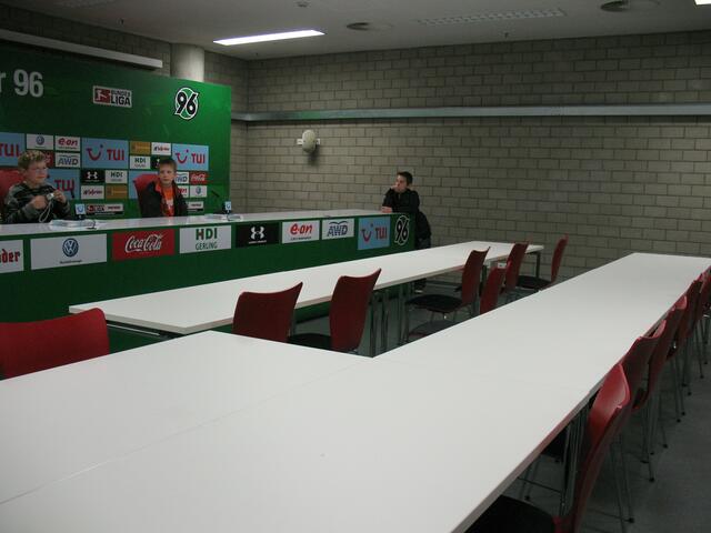 Am gestrigen Montag trafen sich einige my-heimat-User an der AWD-Arena, um an einer von Lars Klingenberg organisierten Führung durch die AWD-Arena teilzunehmen. Zuerst betraten wir mit unserer 96-Begleiterin die AWD-Arena. Dann schauten wir uns den Raum für die Pressekonferenzen an. Einige von uns testeten gleich mal die bequemen Stühlchen, andere wiederum versuchten das my-heimat Schildchen an der Sponsorentafel zu befestigen. Dies wurde dann aber leider von der 96-Begleiterin gesehen....