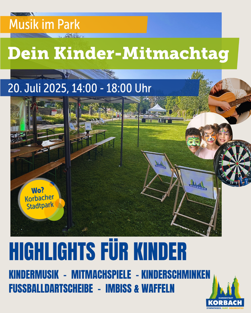 Am Samstag dem 20.7. findet im Stadtpark in Korbach von  14 Uhr 00 Bis 18 Uhr 00  Der Kinder Mitmachtag statt. kommt alle zu uns nach Korbach im Stadtpark und nutzt dem Mitmachtag für Gute Musik sowie Essen und Trinken ist bestens gesorgt. Über Zahlreiche Besucher würden wir uns sehr freuen. Ein Beitrag von Jürgen Hamel Bürgereporter für Myheimat in Korbach