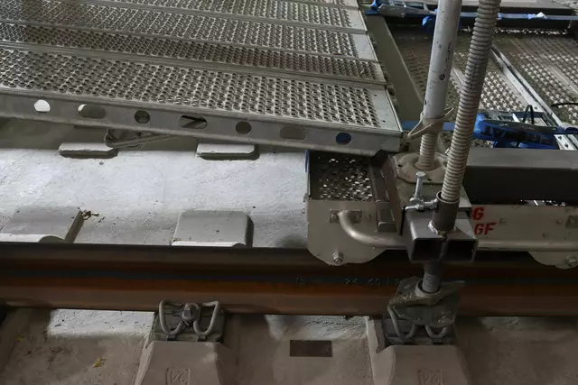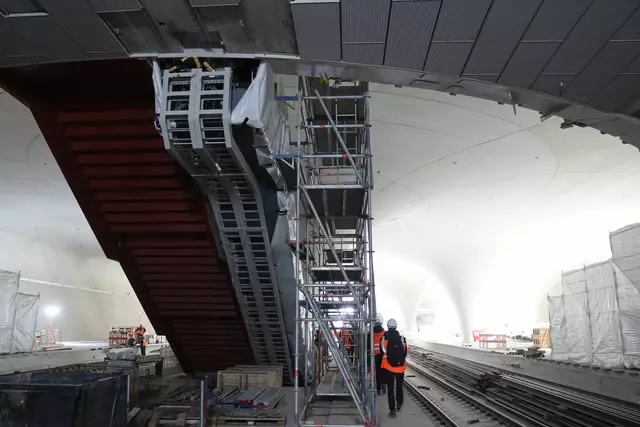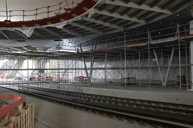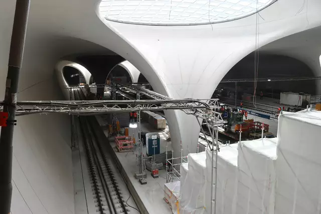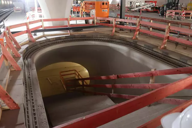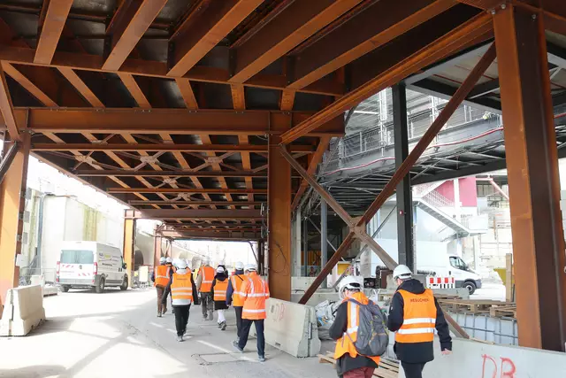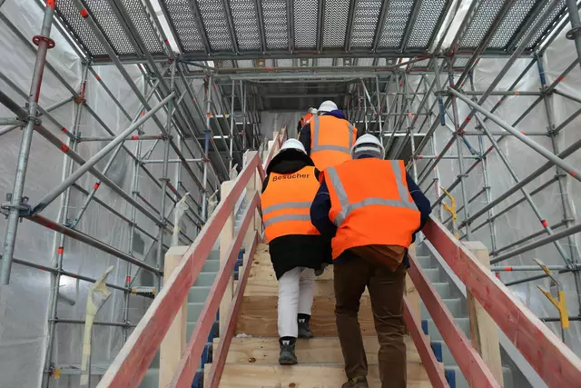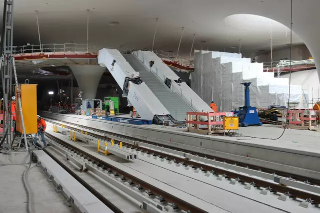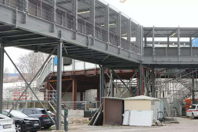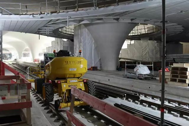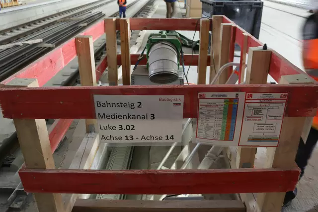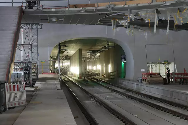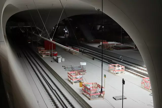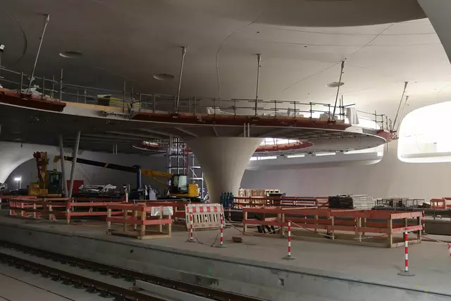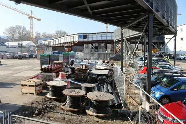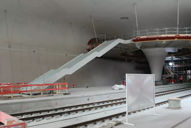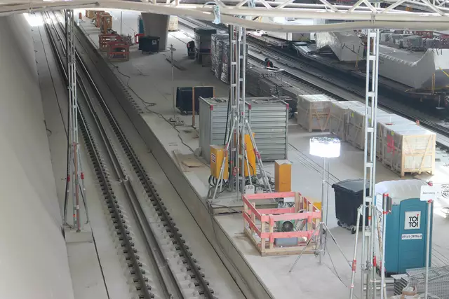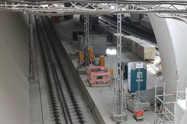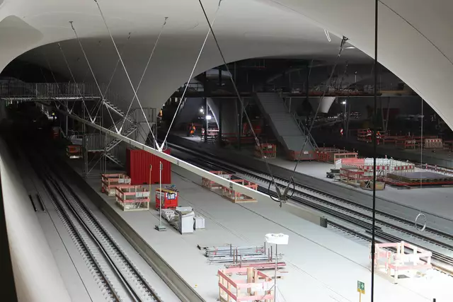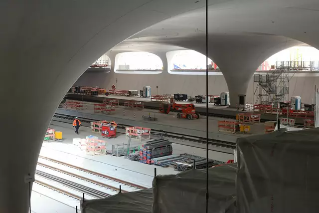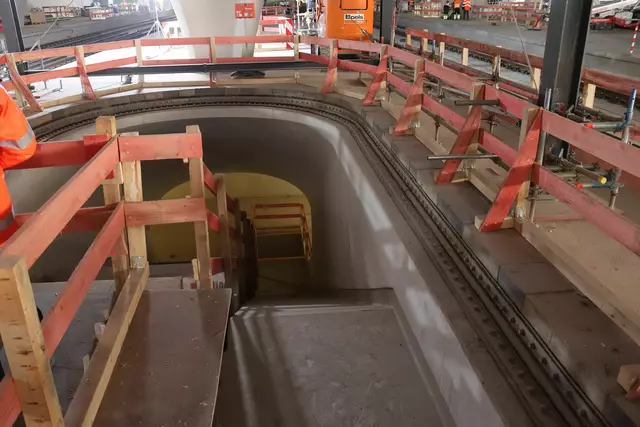 Im neuen Durchgangsbahnhof gibt es oben eine Ebene, auf der Brücken über die Gleise führen. Diese Ebene liegt etwa eine Etage tiefer als der Kopfbahnhof. Treppen führen hinab zu den Gleisen. An den Aufhängungen für die Brücken fanden sich im März noch kleine orange Kästchen mit Elektronik. Dabei handelt es sich um Dehnungssensoren, mit denen überwacht wird, ob es zu eine Überlastung des Materials kommt. Später werden solche Sensoren an passender Stelle eingebaut und nicht mehr sichtbar sein. In...