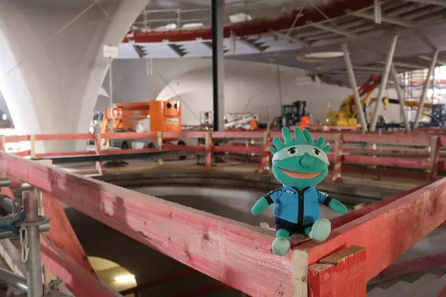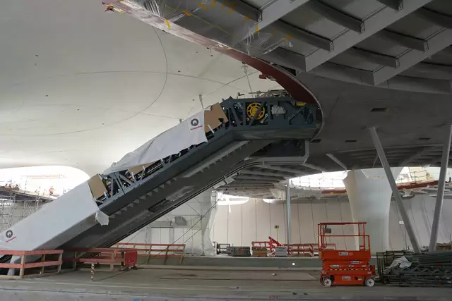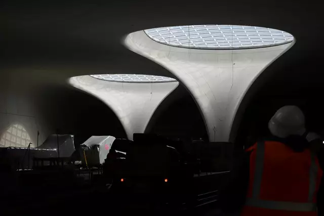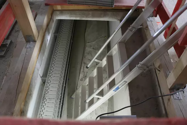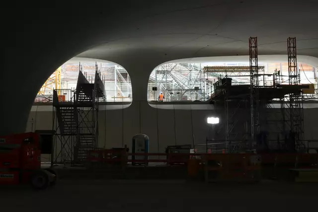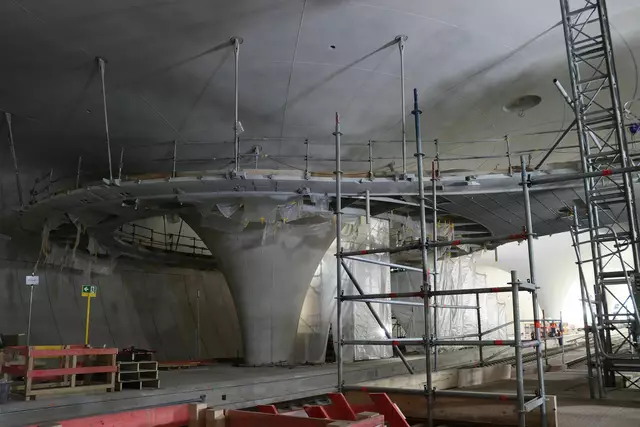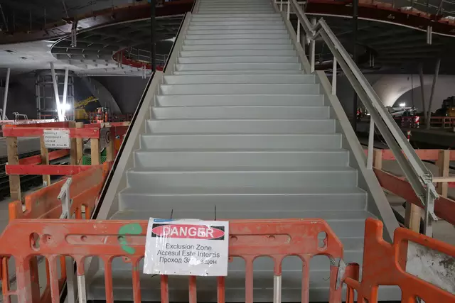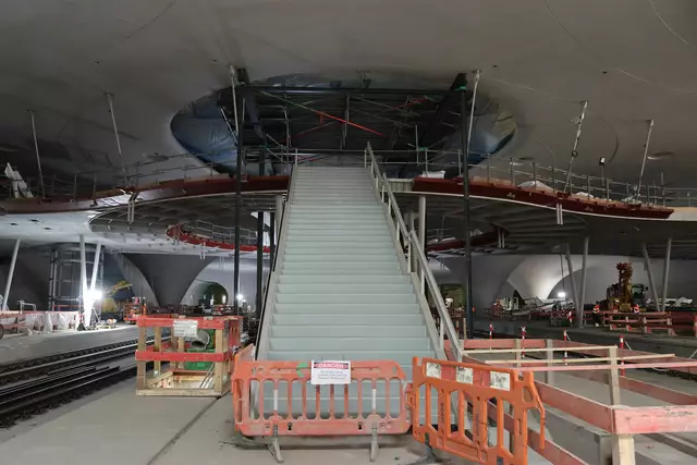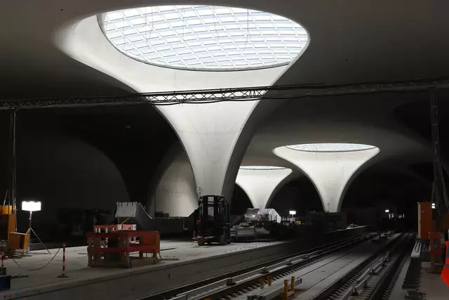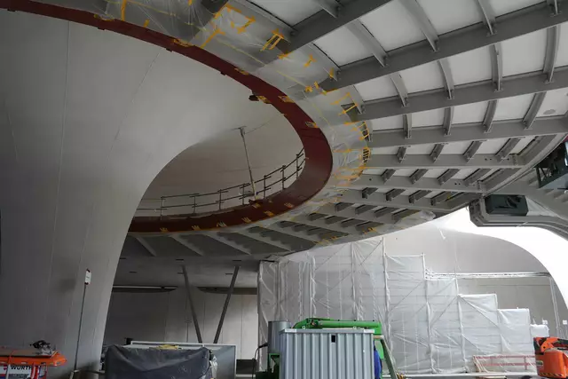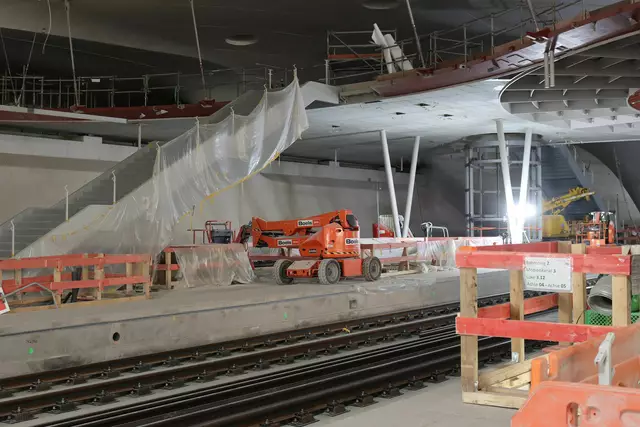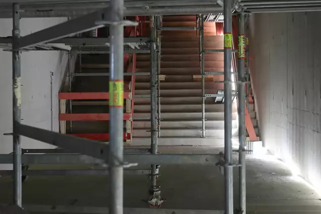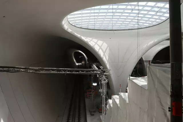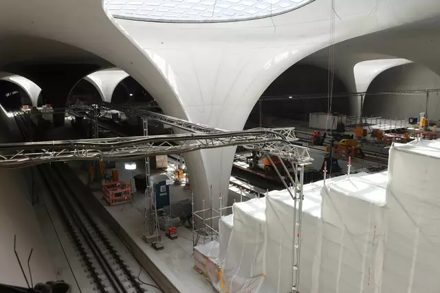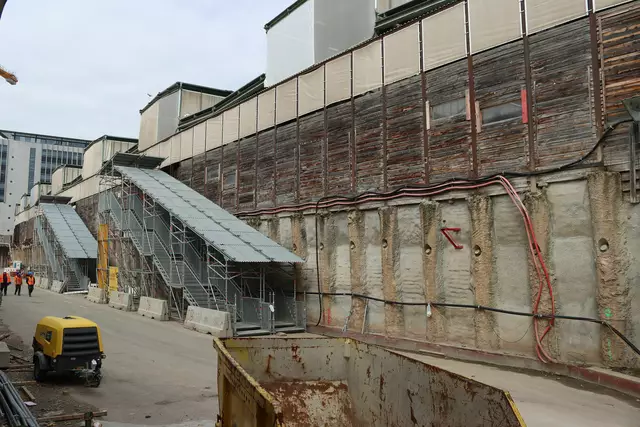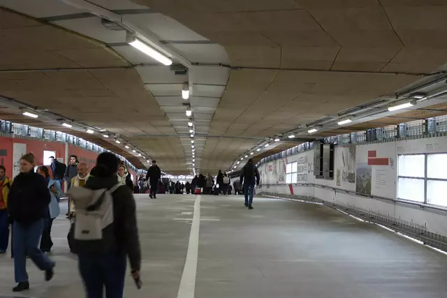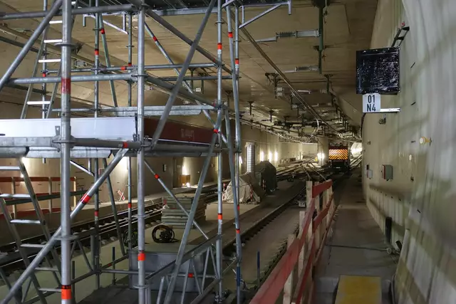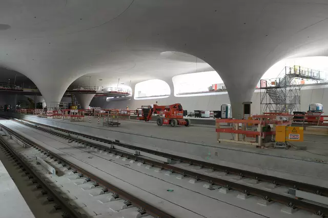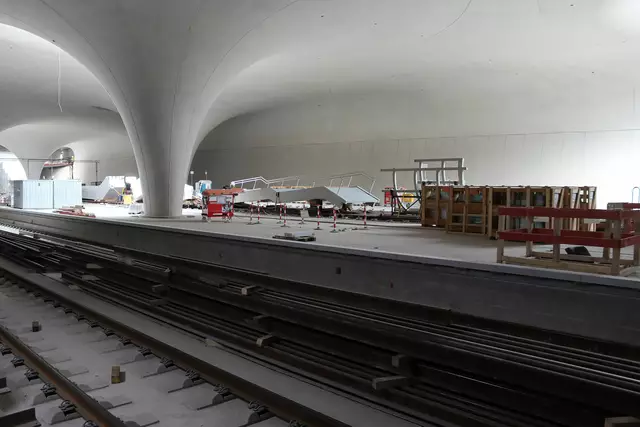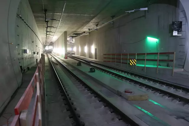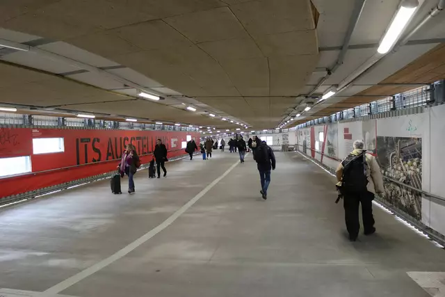 Im neuen Durchgangsbahnhof gibt es oben eine Ebene, auf der Brücken über die Gleise führen. Diese Ebene liegt etwa eine Etage tiefer als der Kopfbahnhof. Treppen führen hinab zu den Gleisen. An den Aufhängungen für die Brücken fanden sich im März noch kleine orange Kästchen mit Elektronik. Dabei handelt es sich um Dehnungssensoren, mit denen überwacht wird, ob es zu eine Überlastung des Materials kommt. Später werden solche Sensoren an passender Stelle eingebaut und nicht mehr sichtbar sein. In...