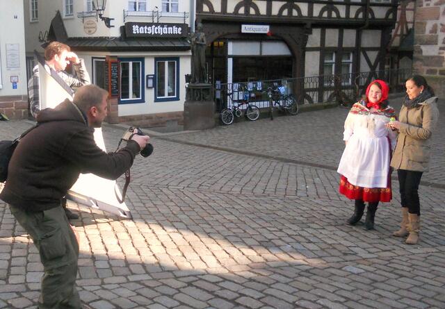 Sechs Autos und zehn Mann hoch - mit enormem Aufwand drehte der SWR am Dienstag und Mittwoch Beiträge für seine neue Sendereihe "Expeditionen in die Heimat". In der Folge, die am 20. April um 20.15 Uhr im dritten Programm des SWR ausgestrahlt wird, besucht das Aufnahmeteam Städte an der Lahn, darunter auch Marburg. Im Grimm-Jahr dreht sich selbstverständlich alles um Grimms Märchen. So war auf dem Markt und den angrenzenden Gässchen neben Rotkäppchen und dem tapferen Schneiderlein auch der...
