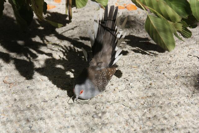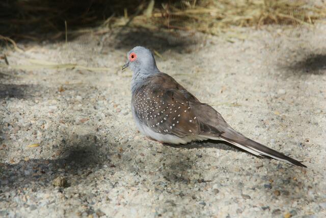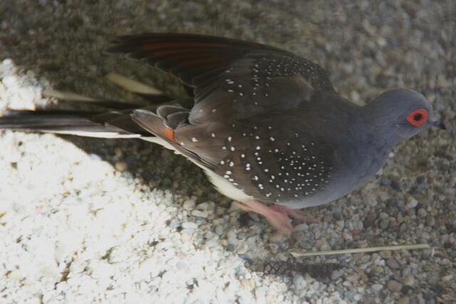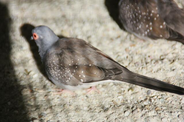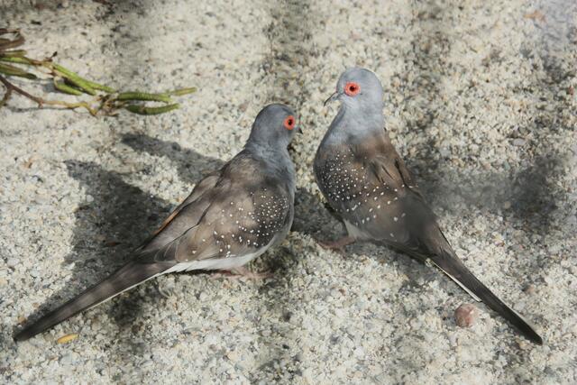Diamanttauben gehören mit einer länge von 19-20 cm zu den kleinsten Taubenarten, Während andere Vögel in der Mittagshitze schatten aufsuchen, sonnen sie sich auf dem bis zu 70 Grad C aufgeheizten Sand. Diese beliebte Ziervögel sind in Australien verbreitet. Als Aufforderung zur Paarung verbeugt sich das Männchen mit aufgefähertem Schwanz mehrmals vor dem Weibchen, knurrt dabei rau, schnäbelt mit ihr und reicht Futter (Bild 1 und 2).