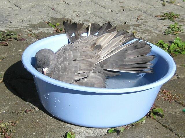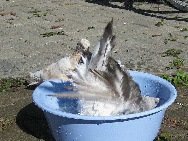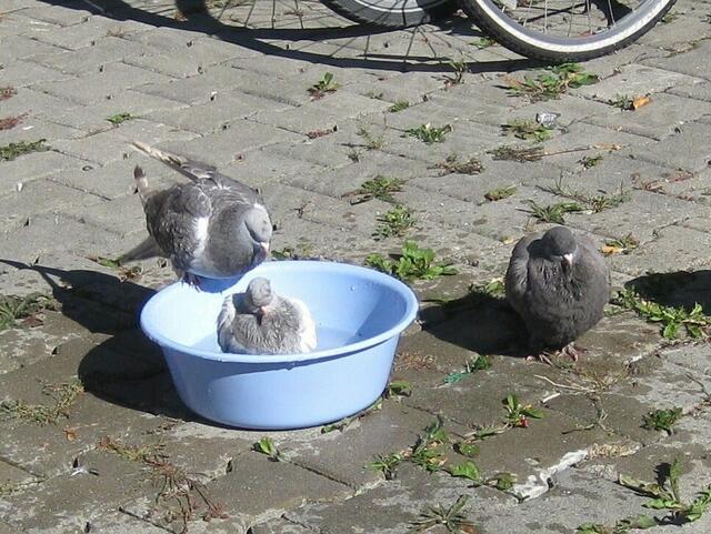 Diesmal landete eine erschöpfte Taube vor unserer Terrassentür. Sie sah auch etwas zerrupft aus. Schnell wurden die Katzen weg gesperrt, denn die erspähten sie natürlich auch. Wenn auch die Kleinen noch etwas Angst vor dem großen Vogel hatten. Es muss ja nicht sein. Gut dass der Käfig, der beim Besuch des Eichkätzchen schon zu Dienste kam, noch nicht weit weg verräumt war. Die beringte Taube wurde nun zusammen mit Wasser und Körnerfutter in den Käfig gesetzt. Bestaunt von den ganz kleinen...