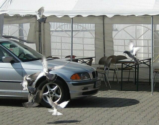 Da fahre ich in Donauwörth mit meinem Auto und suche Opfer zum Fotografieren. Während ich in eine Kurve fahre sehe ich an einem Dach diese Tauben sitzen. Ich parke mein Auto so, daß ich sie beobachten kann. Ich sehe wie sie sich putzen und wie sie hin und her hüpfen, nichts ungewöhnliches. Was kann ich machen, damit es ein bisschen Aktion gibt. Also nehme ich meine Digi in eine Hand und mit der anderen Hand voll auf die Hupe. Die Vögel fliegen alle auf einmal los, ohne daß einer den anderen in...