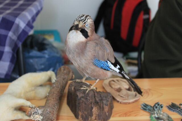 Ist ein rötlichbrauner Rabenvogel mit schwarzem Schwanz, weißem Bürzel, blauweiß gebändertem Flügelbug, weißem Flügelfeld, schwarzweißem Scheitel sowie schwarzem Bartstreif. Ist anzutreffen in aller Art Wälder. Auffällig sein rätschender Warnruf. Flug wirkt unbeholfen. Die Nahrung ist sehr vielseitig, neben tierischer Beute (Insekten,-Larven, Kerbtiere, Schnecken, Eier, Jungvögel und Mäuse) werden v.a. im Herbst Eicheln, Bucheckern und Nüsse gesammelt und als Wintervorrat zwischen Laub, Wurzeln...