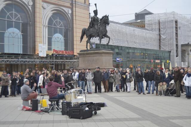 Zwei Trommler zeigen eine tolle Show vor dem Hauptbahnhof auf dem Ernst-August-Platz. Und Sie Trommeln nicht nur auf einem Schlagzeug - das kann ja (fast) jeder, sondern auf allem, was sich ihnen bietet.