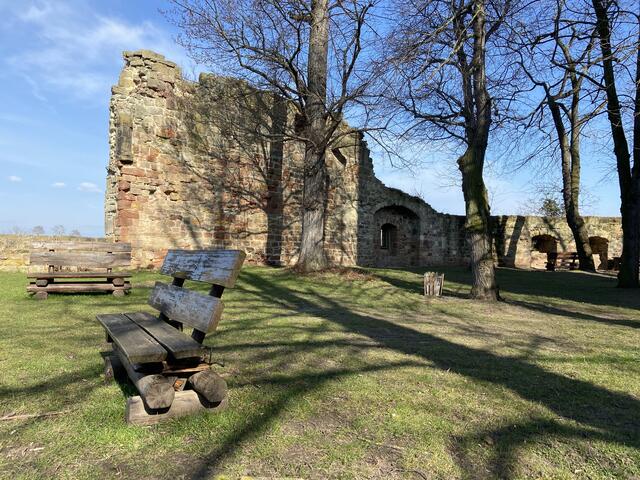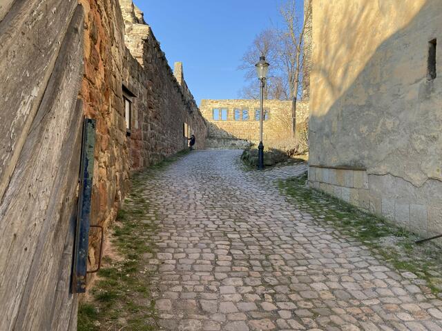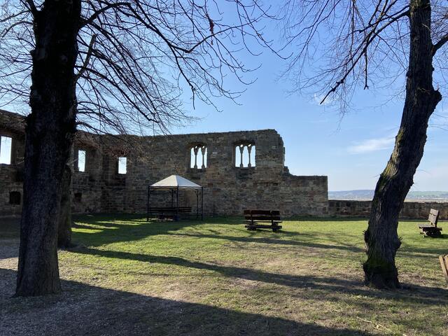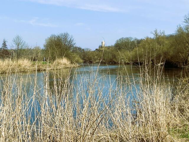 Obwohl der Wind noch recht frisch ins Gesicht wehte, die Sonne machte alles wett. Auch musste man noch nicht ständig zur Seite springen, weil Radfahrer schneller unterwegs sind. Wie für viele von uns, war das gestrige Vorfrühlingswetter ein Traum. Von Naumburg kommend geht’s etwa fünf Kilometer den Saale-Rad-Wanderweg entlang bis zur Burganlage. Urkundlich erstmals erwähnt im 12. Jahrhundert, gehörte sie zum Besitz der Naumburger Bischöfe. Schon von weitem ist der 32 m hohe Bergfried zu sehen.