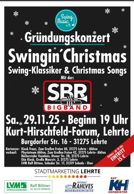 ! Konzertankündigung – SBR Big Band & Swing Music e.V. ! Am Samstag, den 29. November 2025, lädt die SBR Big Band zu ihrem traditionellen Jahreskonzert ein – und diesmal gibt es gleich doppelten Grund zum Feiern, das Konzert ist zugleich das Gründungskonzert des neuen Swing Music e.V.! Veranstaltungsort ist das Kurt-Hirschfeld-Forum, Burgdorfer Str. 16, 31275 Lehrte Konzertbeginn ist um 19:00 Uhr (Einlass 18:00 Uhr) Freuen Sie sich auf einen schwungvollen Abend, mitreißender Rhythmen und echter...