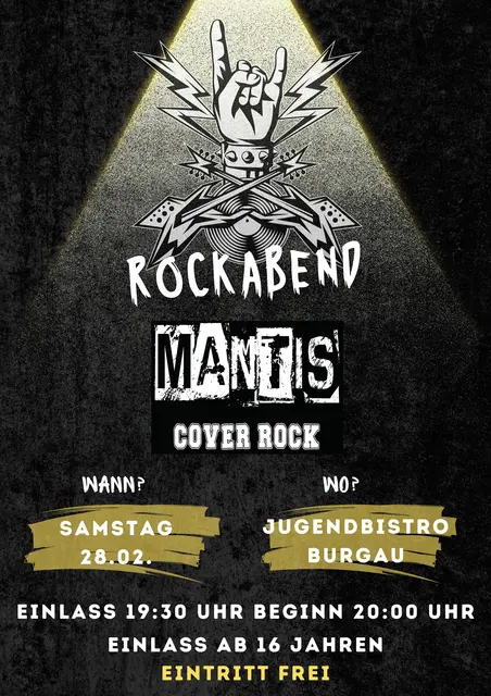 Am Samstag, 28. Februar 2026, wird's laut: Die Cover-Rock-Band "Mantis" bringt das Jugendbistro Burgau zum Beben.  Einlass: 19:30 UhrBeginn: 20:00 UhrEinlass ab 16 JahrenDER EINTRITT IST FREI!!"Mantis": 50 Jahre Rock, ein Sound, keine Kompromisse - keine Frage, wo man an diesem Abend sein sollte! Kommt vorbei und bringt eure Freunde mit!🔥