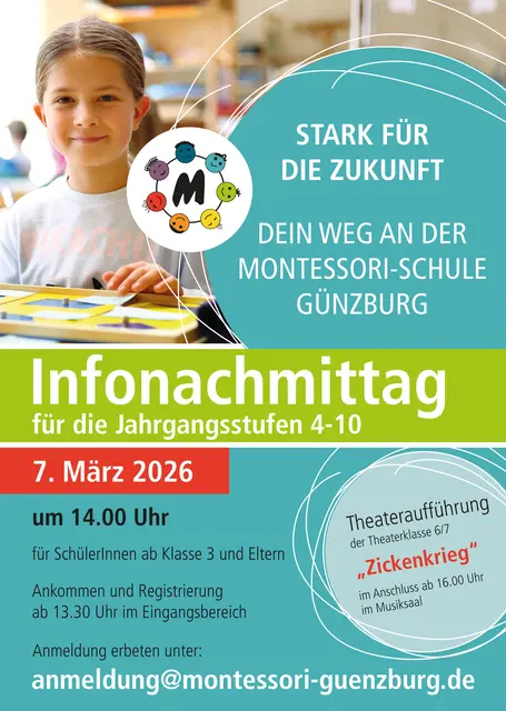 Die Montessori-Schule Günzburg veranstaltet am Samstag, den 07.03.26 um 14.00 Uhr in der Krankenhausstraße 40 einen Infonachmittag für alle Eltern und Schüler/Schülerinnen, die sich für einen Besuch an der weiterführenden Schule (Klassen 4-10) interessieren. Eine Anmeldung für den Infonachmittag ist unter anmeldung@montessori-guenzburg.de möglich. Bereits ab 13.30 Uhr kann man im Eingangsbereich ankommen und die Registrierung vornehmen. Im Anschluss wird um 16.00 Uhr das Theaterstück...