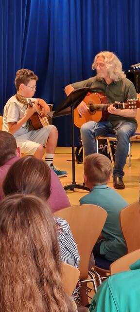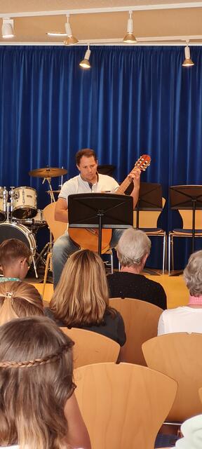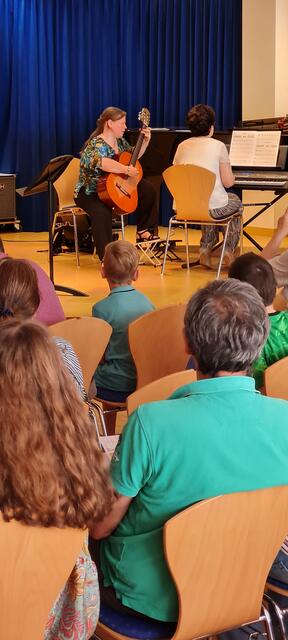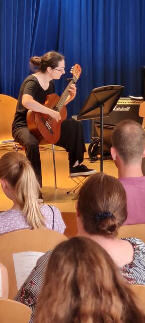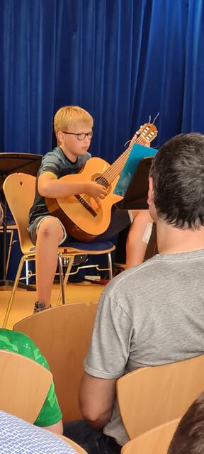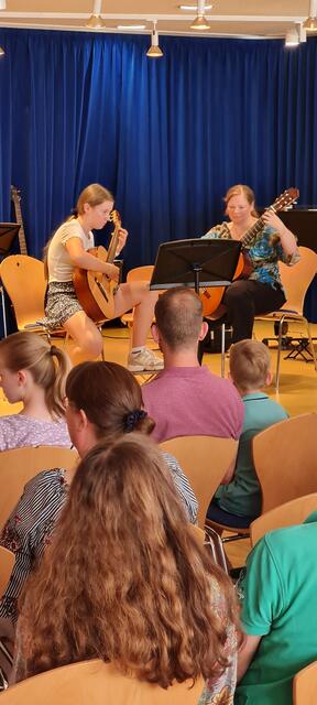 Kurz vor den Sommerferien musizierten die Schüler*innen der Gitarren- und Streicherklasse von Hartmut Hüttner und Krystyna Hüttner gemeinsam im Forum des Wertinger Gymnasiums. Nach einer Pandemiebedingten langen Pausen spielten die jungen Musiker ein lebhaftes und interessantes Programm von der Klassik bis zur Moderne. Das Musizieren mit Abstand stellt an ein Ensemble große Anforderungen. Das sonst ja übliche, gemeinsame Sitzen zu zweit am Pult ist zurzeit nicht möglich. Da heißt es nicht nur...