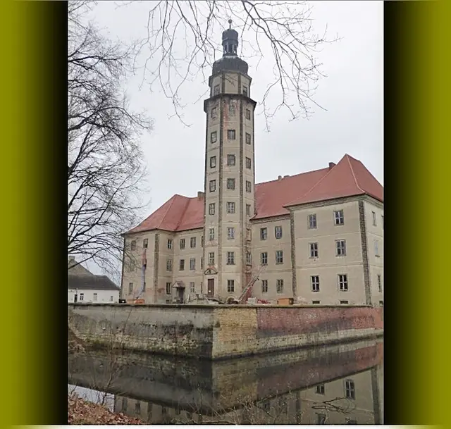 Das Schloss Reinharz ein Wasserschloss bei Bad Schmiedeberg. > wurde zwischen 1690 und 1701 von Heinrich von Löser erbaut > um Adlige während der Jagden in der Dübener Heide unterzubringen. Es ist bekannt für seinen barocken Park mit Schloss und Brauhausteich. Während der DDR - Zeit diente das Schloss als Kurklinik für Krebskranke Frauen.  Von Wasser um das Schloss > war bei meinem Besuch wenig zu sehen. Nun seht es fast im trocknen ! Die letzten 2 Bilder zeigen ein schönes Wasserschloss.