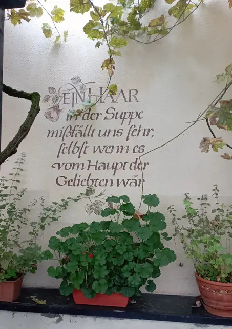 "Des Lebens Freuden sind vergänglich. Das Hühnerauge bleibt empfänglich, wie dies sich äußert, ist bekannt, krumm wird das Bein und krumm die Hand. Die Augenlider schließen sich, das linke ganz absonderlich. Dagegen öffnet sich der Mund, als wollt er flöten, spitz und rund. Zwar hilft so eine Angstgebärde nicht viel zur Linderung der Beschwerde. Doch ist sie nötig jederzeit zu des Beschauers Heiterkeit."