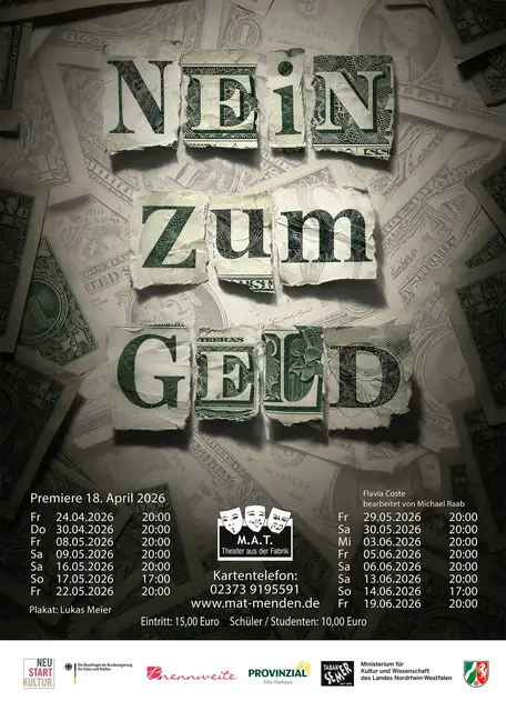 M.A.T – Menden – Theater aus der Fabrik – zeigt das Stück „Nein zum Geld“ von Flavia Coste, bearbeitet von Michael Raab! Am Samstag, 18.04.2026, 20.00 Uhr, ist Premiere!!!