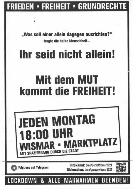 Zu einer genehmigten Versammlung trafen sich am Valentinstag 2022 ca. 500-600 Bürger aus Wismar und Umgebung. Unter dem Motto: Frieden-Freiheit.Grundrechte -Lockdown & Alle Maßnahmen beenden versammelten sich wiederholt zahlreiche Bürger um für ihre Grundrechte einzutreten und Widerstand gegen die geplante Impfpflicht zu leisten. Reinhard Mey - Seid Wachsam Die Demonstranten zogen durch die Innenstadt um so auf ihr Anliegen aufmerksam zu machen und den Protest einer breiten Öffentlichkeit...