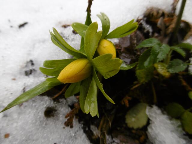 Heute ist der Schnee in meinem Garten fast weggeschmolzen und was sehe ich, erste gelbe Blütenköpfe von meinen Winterlingen luckten hervor. Es ist zwar noch Februar und Winter