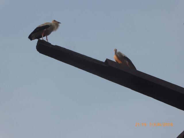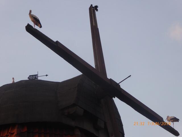 ... erst flogen die 2 Störche immer um die Mühle. Dann setzten sie sich auf die Flügel. Ein 3. Storch flog weiterhin um die Mühle. Ein Storch näherte sich dann Schritt für Schritt dem anderen Storch - dem das jedoch nicht gefiel.