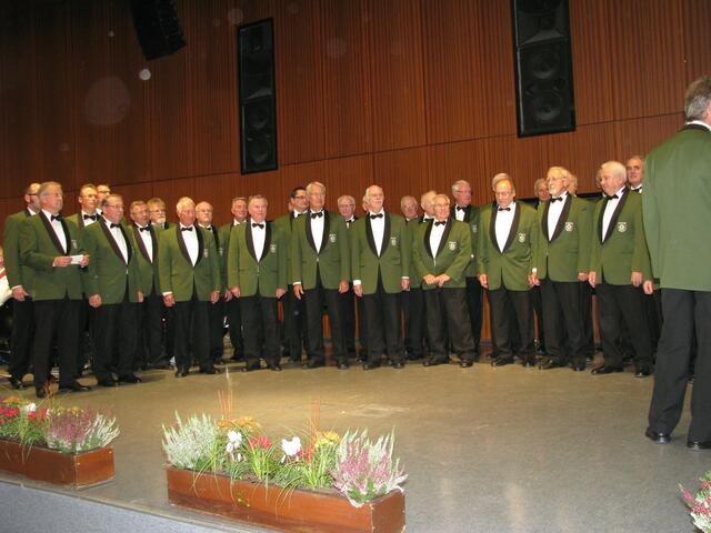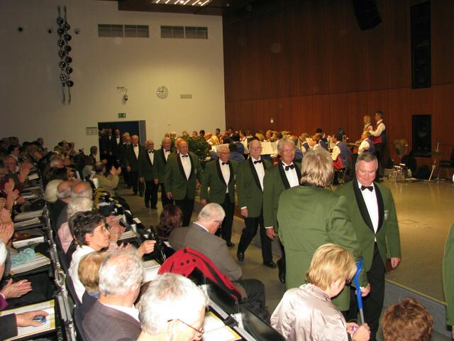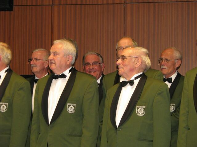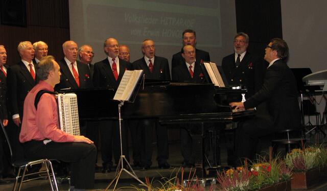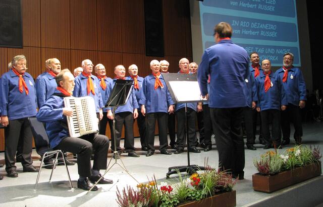 Und dann hatten unsere Gäste aus dem Norden ihren ersten Auftritt. Unter Krzystof Skladanowski als Dirigent und am Flügel und Igor Gugenheimer am Akkordeon eröffneten die „Blauen Jungs“ mit „Conquest of Paradise“ ihren Part. Weiter ging es mit dem „Slowenischen Weinstrauß“ und Werner Behling als Solist über „Die Rose“ zur „Volkslieder Hitparade“ von Erwin Hovarka. Gerade mit dem letztgenannten Beitrag hatten sie die Zuhörer auf ihrer Seite: ging doch ein leises Mitsummen durch die Zuschauerreihen.