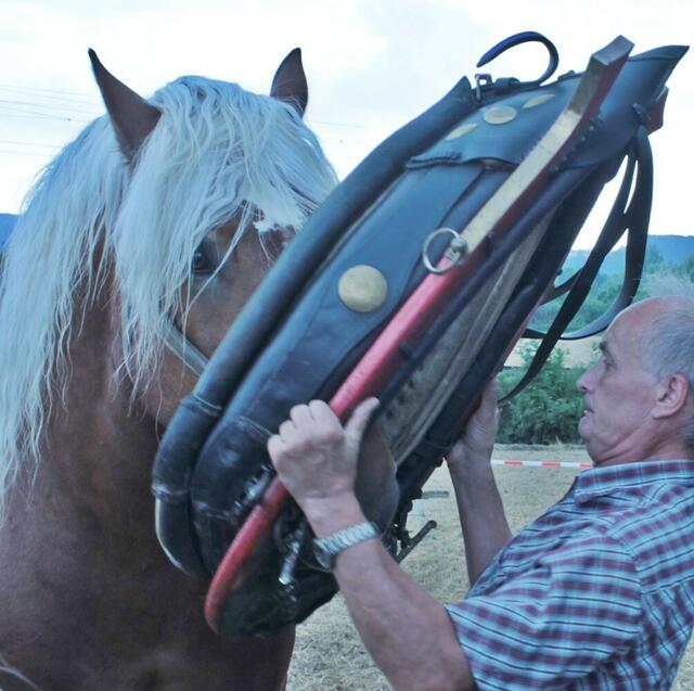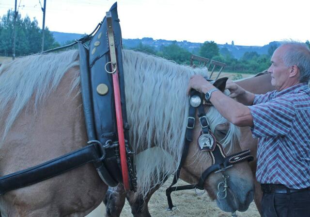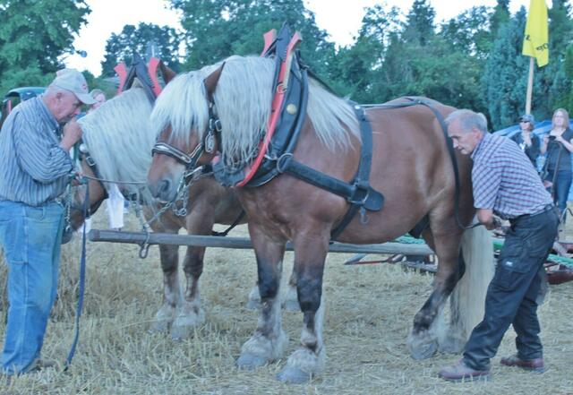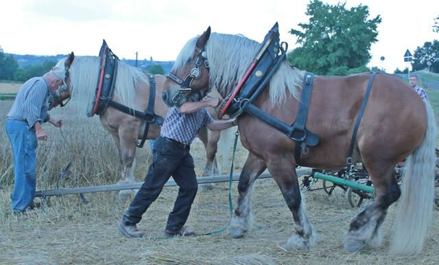 Getreidemäharbeiten mit einem Pferdefuhrwerk hatte ich lange nicht mehr gesehen und so wie mir ging es wohl auch den meisten der Zuschauer. Zwei französische Kaltblüter standen hier (16 und 13 Jahre alt) und wurden angeschirrt. Die Kaltblüter sind in der Landwirtschaft als Zugtiere gut geeignet. Bedächtig wurden sie zum Mäher am oberen Ende des Feldes geführt. Die beiden Pferde treten langsam und vorsichtig zur Deichsel hin zurück und wurden mit den Deichselketten befestigt. Die beiden Sitze auf dem Mäher waren für den Pferdelenker und den Bediener des Mähbalkens vorgesehen.