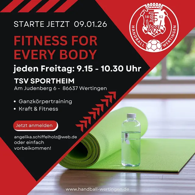 Die Handballabteilung des TSV Wertingen erweitert ihr Sportangebot und bietet ab sofort jeden Freitag einen Fitnesskurs an. Unter dem Titel „Fitness for Every Body“ wird ein abwechslungsreiches Ganzkörpertraining mit Fokus auf Kraft und allgemeine Fitness angeboten.Geleitet wird der Kurs von der 47-jährigen Angelika Schiffelholz aus Wertingen. Die ausgebildete Übungsleiterin verfügt über langjährige Erfahrung: Sie war mehr als zehn Jahre als Kickboxtrainerin tätig und leitet seit fünf Jahren das Taekwondo-Kindertraining in Emersacker. "Mit meinem Angebot möchte ich Menschen jeden Alters und Fitnesslevels ansprechen und zu mehr Bewegung im Alltag motivieren. Besonders wichtig ist mir dabei der gemeinsame Sport in der Gruppe, der motiviert und Spaß macht – gerade auch vormittags, etwa für Eltern, die abends wenig Zeit haben."Das Training findet immer freitags von 9.15 bis 10.30 Uhr im Sportheim Wertingen statt Eine Anmeldung ist per E-Mail an angelika.schiffelholz@web.de möglich, alternativ können Interessierte auch gerne unverbindlich vorbeikommen und teilnehmen.Mit dem neuen Kursangebot möchten wir als Handballabteilung des TSV Wertingen ein weiteres Zeichen für sportliche Vielfalt und Gesundheitsförderung in der Region setzen!
